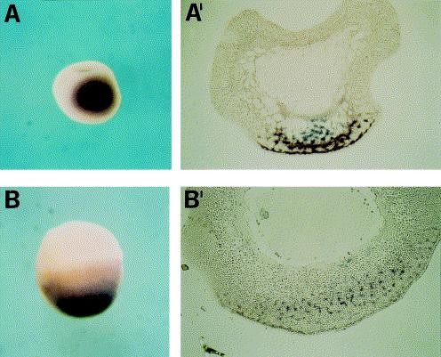 Fig. 4. Comparison between Xwnt11 and Xotx1; and between Vg1 and Xotx1 expression domains. In (A), a stage III oocyte is showed, hybridized with Xwnt11 (blue) and Xotx1 (brown); in (Aâ²) is a section through the (A) sample. In (B), a stage IV oocyte is showed, hybridized with Xotx1 (blue) and Vg1 (brown); in (Bâ²) is a section through the (B) sample.