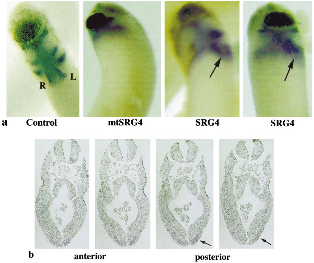 the SRG4-injected embryos display an expanded domain of Nkx2.5 transcription in the left primordium (arrows). (b) An embryo injected