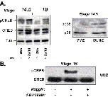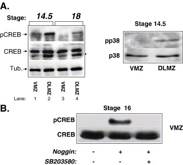 Fig. 1. p38MAPK and its substrate CREB are phosphorylated in DLMZ but not in VMZ explants. (A) VMZ and DLMZ explants were dissected at stage 10.25, and cultured until sibling embryos reached later gastrula and neurula stages as indicated. Proteins were extracted from 18 explants and CREB, phospho CREB (pCREB), α tubulin, p38 and phospho p38 (pp38) were detected by Western analysis. The asterisk represents an unidentified cross-reacting protein. (B) VMZ explants were isolated at stage 10+, incubated with Noggin or SB203580 (30 μM) and cultured until sibling embryos reached stage 16. Proteins were extracted from 18 explants. CREB and phospho CREB were detected by Western blotting.