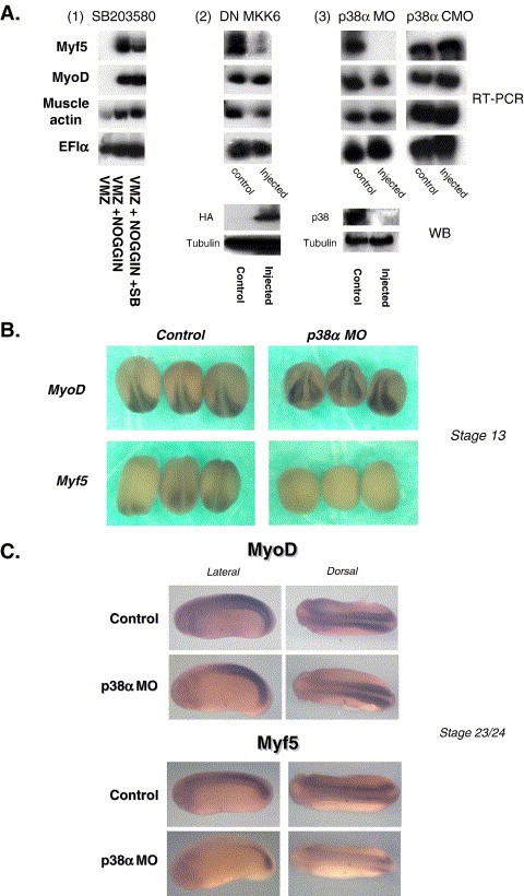 The p38MAPK signaling pathway is essential for skeletal muscle differentiation in tissue culture models. We demonstrate a novel role for p38MAPK in myogenesis during early Xenopus laevis development. Interfering with p38MAPK causes distinct defects in myogenesis. The initial expression of Myf5 is selectively blocked, while expression of MyoD is unaffected. Expression of a subset of muscle structural genes is reduced. Convergent extension movements are prevented and segmentation of the paraxial mesoderm is delayed, probably due to the failure of cells to withdraw from the cell cycle. Myotubes are properly formed; however, at later stages, they begin to degenerate, and the boundaries between somites disappear. Significant apoptotic cell death occurs in most parts of the somites. The ventralbody wall muscle derived from migratory progenitor cells of the ventralsomite region is poorly formed. Our data indicate that the developmental defects caused by p38alpha-knockdown were mediated by the loss of XMyf5 expression. Thus, this study identifies a specific intracellular pathway in which p38MAPK and Myf5 proteins regulate a distinct myogenic program.