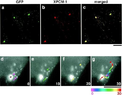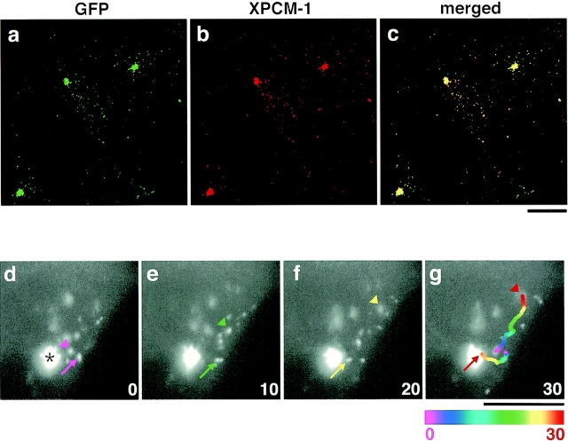 Figure 3. Movement of GFP-tagged centriolar satellites in live A6 cells. a–c, GMX-A6 cells, A6 transfectants stably expressing GFP fusion protein with the middle portion of XPCM-1 (GFP-MX), were stained red with anti–XPCM-1 pAb. Since this pAb did not recognize GFP-MX, it represented the localization of endogenous XPCM-1 (b). Most of the green fluorescence from expressed GFP-MX (a) was colocalized with endogenous XPCM-1 (b and c). d–g, Image series of GMX-A6 cells showing the movement of GFP-tagged centriolar satellites. Numbers at the bottom right indicate the time lapse in seconds. Arrows show the movement of granules toward the centrosome (asterisk), and arrowheads indicate granules moving toward the cell periphery. When the granules moved quickly during 1-s exposure of the CCD camera, they appeared tube-like in shape (arrow in f). In g, the paths of movement of two granules during 30 s were traced, which were represented in 2-s intervals beginning with the coolest colors (purple) and proceeding to the hottest colors (red). Bars, 10 μm. |