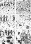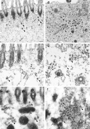 Figure 7. Localization of mPCM-1 in nasal respiratory epithelial cells at four days after exposure to distilled water (a–c) or irritation with 1% aqueous ZnSO4 (d–f). a, Conventional ultrathin EM. Electron-dense spherical granules (arrowheads), ∼70–100 nm in diameter, which were morphologically indistinguishable from centriolar satellites, were scattered close to ciliary basal bodies (asterisks). Open arrows, microtubules. b, Preembedding immunoelectron microscopy. Nasal epithelial tissues were treated with 0.5% Triton X-100, fixed with glutaraldehyde, then labeled with anti–mPCM-1 pAb. The centriolar satellite-like granules were specifically labeled (arrowheads). c, Postembedding immunoelectron microscopy. Ultrathin cryosections of nasal epithelial cells were labeled with anti–mPCM-1 pAb. The centriolar satellite-like granules were specifically labeled (arrowheads). d, Conventional ultrathin EM. Cilia were completely removed, and at the apical cytoplasm numerous fibrous granules (arrowheads), as well as deuterosomes (arrows), appeared. e, Preembedding immunoelectron microscopy. Samples were treated with 0.5% Triton X-100, fixed with glutaraldehyde, then labeled with anti–mPCM-1 pAb. Fibrous granules (arrowheads), but not deuterosomes (arrow), were heavily labeled. Both centriolar and acentriolar pathways for centriolar replication were observed (see details in the text). f, Postembedding immunoelectron microscopy. Ultrathin cryosections were labeled with anti–mPCM-1 pAb. Fibrous granules (arrowheads), but not deuterosomes (arrow), were specifically labeled. Bars, 200 nm. |