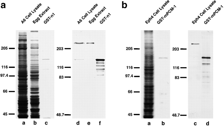 Figure 1. Specificity of pAbs. a, Rabbit anti–Xenopus PCM-1 (XPCM-1) pAb. Total cell lysate of cultured Xenopus A6 cells (A6 Cell Lysate) and Xenopus egg extract (Egg Extract), and purified GST fusion protein with the COOH-terminal portion of XPCM-1 produced in E. coli (GST-n1) were separated by SDS-PAGE (a–c; CBB staining), followed by immunoblotting with anti–XPCM-1 pAb (d–f). This affinity-purified pAb specifically recognized ∼230 kD XPCM-1 in d and e, as well as GST fusion protein in f. b, Rabbit anti–mouse PCM-1 (mPCM-1) pAb. Total cell lysate of cultured mouse Eph4 cells (Eph4 Cell Lysate) and purified GST fusion protein with the COOH-terminal portion of mPCM-1 produced in E. coli (GST-mPCM-1) were separated by SDS-PAGE (a and b; CBB staining), followed by immunoblotting with anti–mPCM-1 pAb (c and d). This affinity-purified pAb specifically recognized ∼230 kD mPCM-1 in c, as well as GST fusion protein in d. |