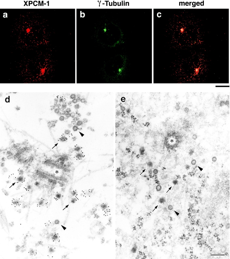 Figure 2. Subcellular localization of XPCM-1 in A6 cells. a–c, Double immunofluorescence staining of A6 cells with anti–XPCM-1 pAb (a) and anti–γ-tubulin mAb (b). The merged image (c) revealed that most of the XPCM-1–positive granular structures were concentrated on and/or around γ-tubulin–positive centrosomes. Small numbers of XPCM-1–positive granular structures were observed scattered in the cytoplasm. Bar, 10 μm. d, Localization of XPCM-1 at centriolar satellites. When A6 cells were treated with Triton X-100 and labeled with anti–XPCM-1 pAb, numerous electron dense granules (arrows) around the centrosome (asterisk) were specifically labeled at the electron microscopic level. Some granules appeared to be associated with MTs. Note that pale granules (arrowheads) with similar diameter were not labeled. e, Ultrastructure of centrosomes of A6 cells in situ. A6 cells were processed for ultrathin EM without Triton X-100 treatment. Note the so-called centriolar satellites (arrows) and pale granules (arrowheads) around the centrosome (asterisk). Bar, 200 nm. |