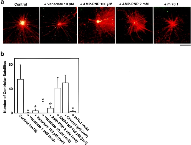 Figure 5. Inhibition of the accumulation of GFP-tagged centriolar satellites around centrosomes in vitro. A reconstituted aster (red) was incubated with GFP-tagged centriolar satellites (green) under the same condition as Fig. 4 a. Without additional reagents, numerous granules were accumulated around the centrosome during 10-min incubation (Control). AMP-PNP at 2 mM, but not 100 μM, significantly suppressed the accumulation of granules. 10 μM vanadate, as well as antidynein intermediate chain mAb (m70.1), also completely suppressed the accumulation. When the accumulation was suppressed, the movement of individual granules itself was always affected. Bar, 10 μm. b, The number of centriolar satellites, which were accumulated around centrosomes during 10-min incubation, were counted per individual centrosomes. Asterisks, F-test showed significant inhibition (P < 0.001). |