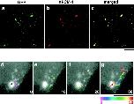 Figure 4. In vitro motility of GFP-tagged centriolar satellites. a, Time-lapse observation of the movement of a centriolar satellite (green) in a reconstituted aster (red). The boxed area in the large panel is magnified in the small panels. Numbers at the bottom left in the small panels indicate the time lapse in seconds. GFP-tagged centriolar satellite (arrowheads) moved along a MT toward centrosomes where other granules had already accumulated. On the way to the centrosome, this granule changed MTs (arrows), and finally reached the centrosome. Bar, 10 μm. A QuickTime movie is available at http://www.jcb.org/cgi/content/147/5/969/F4/DC1. b, Immunoelectron microscopy of centriolar satellites accumulating around centrosomes in the in vitro reconstituted asters. Electron-dense granular structures, ∼80–90 nm in diameter, which were specifically labeled with anti–XPCM-1 pAb (10-nm gold particles), were accumulated around fibrous materials of centrosomes. These XPCM-1–containing granules were not delineated by membranes. Bar, 200 nm. |