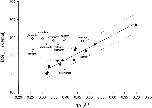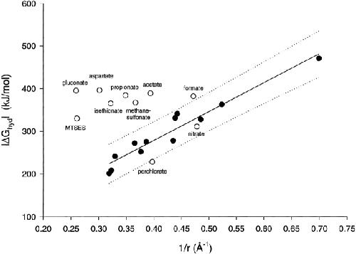 Figure 1. The absolute value of the hydration energy (|ΔGhyd|) plotted as a function of reciprocal anion radius (or equivalent sphere radius). The filled circles represent the halides and pseudohalides (Table ), and the open circles represent the polyatomic anions, which are noted on the figure for clarity. The solid line is the best fit to the data for the halides and pseudohalides; it has a slope of 674.5, y intercept of 8.8, and a correlation coefficient of 0.94. The dotted lines are the 95% prediction intervals (confidence intervals of the population).