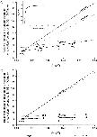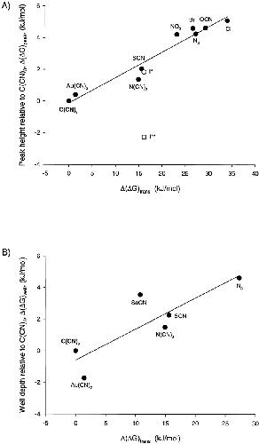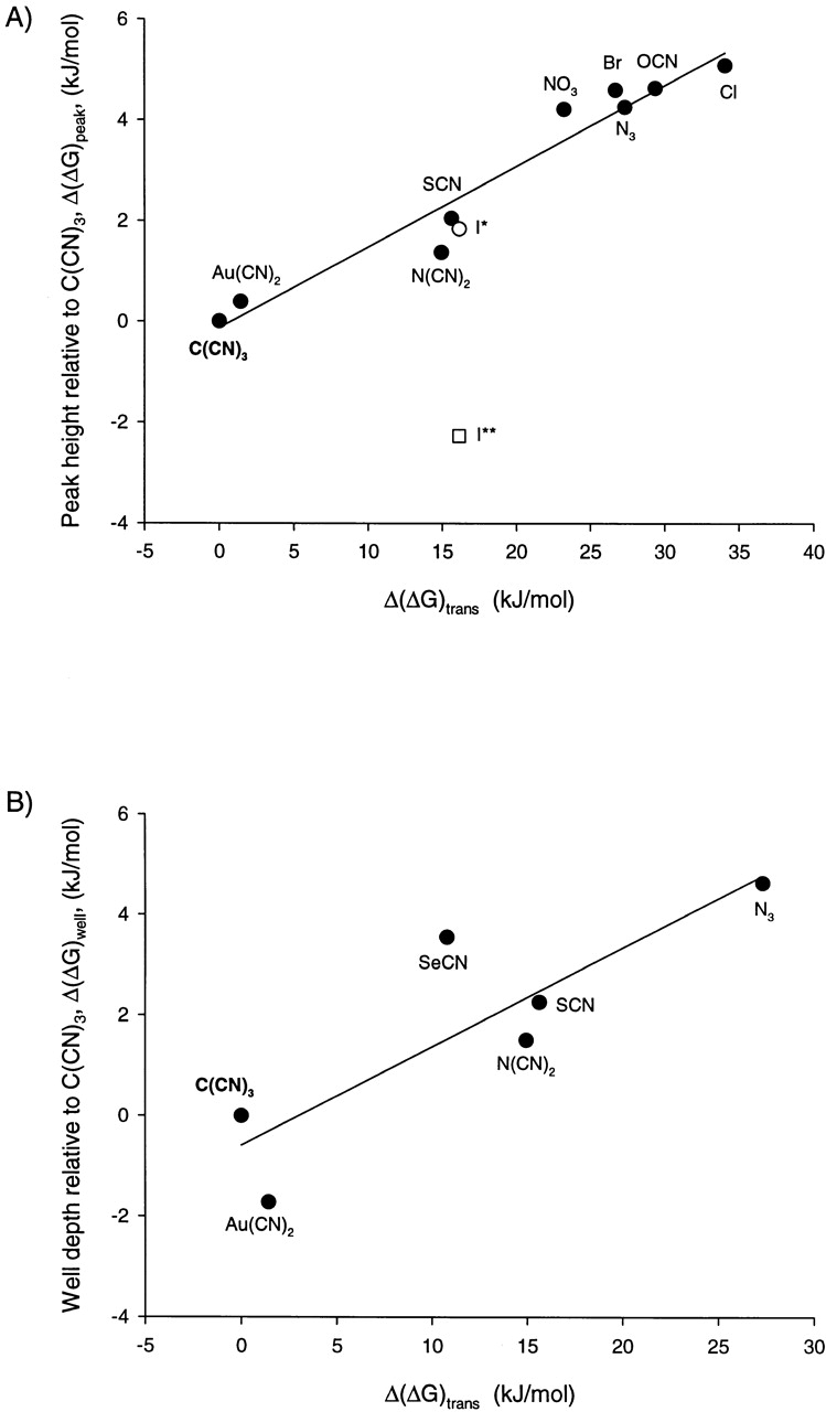 Figure 2. (A) CFTR permeability selectivity and PVC-TDMAC membrane selectivity. CFTR permeability ratios (Table ) expressed as differences in the peak heights (kJ/mol) plotted as a function of Δ(ΔG)trans for the PVC-TDMAC membrane, which has the units of kilojoules per mole (see ). Both variables are defined with respect to tricyanomethanide, so that the y and x axes reflect, respectively, the magnitude of the increase in the apparent peak barrier height and the increase in the water-electrode transfer free energy. The line shown is a linear regression with a slope of 0.16 and correlation coefficient (r2) of 0.93. The iodide point (○) flagged with an asterisk reflects a PI/PCl of 2.1, as determined by Tabcharani et al. 1997, whereas the lower value (□), PI/PCl of 0.4, flagged with a double asterisk, is more often seen with CFTR (Anderson et al. 1991; Sheppard et al. 1993; Mansoura et al. 1998). (B) CFTR binding selectivity and PVC-TDMAC membrane selectivity. The ratio of the apparent half-maximal inhibition constants expressed as relative differences in well depth (kJ/mol) are plotted as a function of Δ(ΔG)trans for the PVC-TDMAC (kJ/mol). Both variables are defined with respect to tricyanomethanide. The line shown is a linear regression with a slope of 0.196 and a correlation coefficient of 0.73.