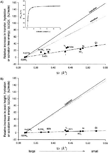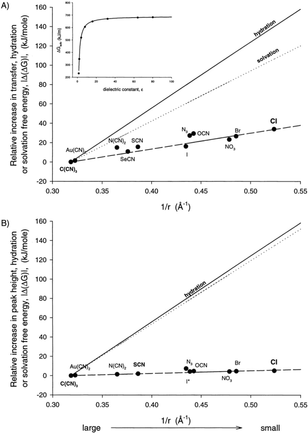 Figure 3. (A) Energetic analysis of PVC-TDMAC membrane selectivity. The filled circles represent the equilibrium transfer energy [Δ(ΔG)trans] for each anion relative to the value of C(CN)3 plotted as function of reciprocal anion radius, 1/r (Table ), and the dashed line is the best fit to the points. The solid line is the relative hydration energy [|Δ(ΔG)hyd|, C(CN)3 reference] calculated using and plotted versus 1/r. The dotted line is the relative solvation energy [|Δ(ΔG)solv|, C(CN)3 reference] calculated as Δ(ΔG)hyd − Δ(ΔG)trans. (A, inset) The free energy of transfer for a spherical test charge of 1-Å radius, plotted as a function of the dielectric constant of the medium to which the ion is being transferred from a vacuum according to . (B) Energetic analysis of CFTR permeability selectivity. The solid circles represent the relative peak height [Δ(ΔG)peak, C(CN)3 reference] calculated from the permeability ratios (Table ) plotted as function of reciprocal anion radius, 1/r (Table ). The dashed line is the best fit to the data points. The solid line is the relative hydration energy [|Δ(ΔG)hyd|, C(CN)3 reference] calculated using vs. 1/r. The dotted line is the apparent relative solvation energy [|Δ(ΔG)solv|] calculated by subtracting the best fit to the data points from |Δ(ΔG)hyd|.