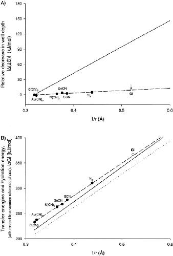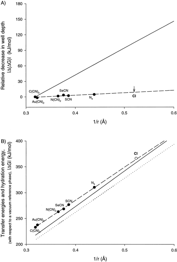 Figure 6. (A) Energetics of CFTR relative binding selectivity. The filled circles are the relative well depth [|Î(ÎG)well|, C(CN)3 reference] calculated using the ratio of the apparent inhibition constants (Table ) plotted as function of reciprocal anion radius, 1/r (Table ). The dashed line is the best fit to the data points. The solid line is the relative hydration energy [|Î(ÎG)hyd|, C(CN)3 reference] calculated using plotted vs. 1/r for reference. Due to the fact that the measurements were made with respect to Cl (see materials and methods), it is not possible to calculate a value for Cl; however, the plot permits an extrapolation for Cl based on the size of the anion (highlighted with an arrow). (B) Anion-channel stabilization energies at the binding site plotted with respect to a vacuum reference phase. The filled circles are the well depths set by fixing the well depth for SCN at 12.5 kJ/mol (5.1 RT, based on the dissociation constant of 6.4 mM reported by Tabcharani et al. 1993) and adding the hydration energy plotted as function of reciprocal anion radius, 1/r. The dashed line is the best fit to the data points. The Cl point (â) shown is the well depth of 8.2 kJ/mol, based on the reported dissociation constant for Cl of 38 mM reported by Tabcharani et al. 1997, shown for comparison. The solid line is the hydration energy, |ÎGhyd|, calculated using plotted vs. 1/r. The dotted line is the solvation energy, |ÎGsolv|, calculated for a homogenous medium with a dielectric constant of 19 using plotted vs. 1/r, as in Fig. 4. Note that values of transfer energy greater than the hydration energy reflect energetic wells, whereas values less than the hydration energy reflect energetic barriers.