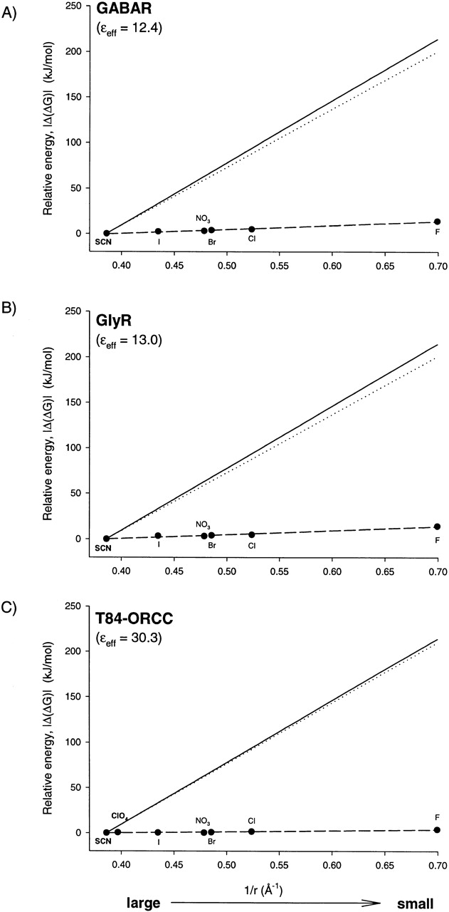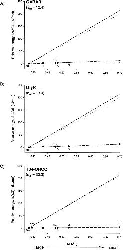 Figure 5. Energetics of permeability selectivity for GABAR (A), GlyR (B), and the T84-ORCC (C). The filled circles represent the relative peak heights [Î(ÎG)peak, SCN reference] calculated from the reported permeability ratios (Bormann et al. 1987; Halm and Frizzell 1992) plotted as function of reciprocal anion radius, 1/r (Table ). The dashed line is the best fit to the data points. The solid line is the relative hydration energy [|Î(ÎG)hyd|, SCN reference] calculated using vs. 1/r. The dotted line is the apparent relative solvation energy [|Î(ÎG)solv|] calculated by subtracting the best fit to the data points from |Î(ÎG)hyd|.