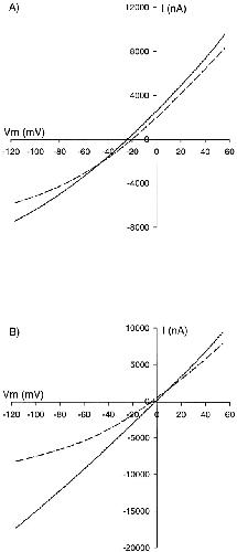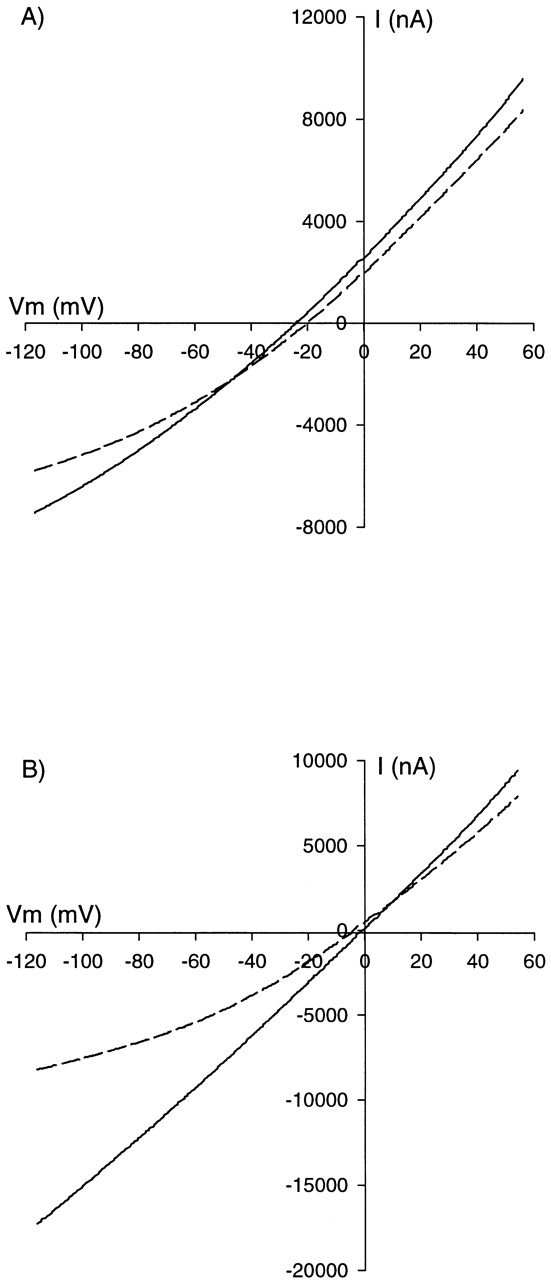 Figure 7. Iodide block of CFTR current. (A) The solid line is the cAMP-activated current (10 μM forskolin + 1 mM IBMX) in standard frog ringer (materials and methods) for an oocyte expressing wtCFTR. The dashed line is the current 2 min after the addition of 5 mM NaI to the perfusate. (B) The solid line is the cAMP-activated current (10 μM forskolin + 1 mM IBMX) in a reduced Cl frog ringer (30 mM Cl; 70 mM aspartate) for an oocyte expressing wtCFTR. The dashed line is the current 2 min after the addition of 5 mM NaI to the perfusate. The data was collected using a ramp protocol as noted in materials and methods.