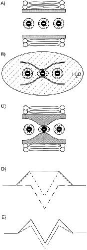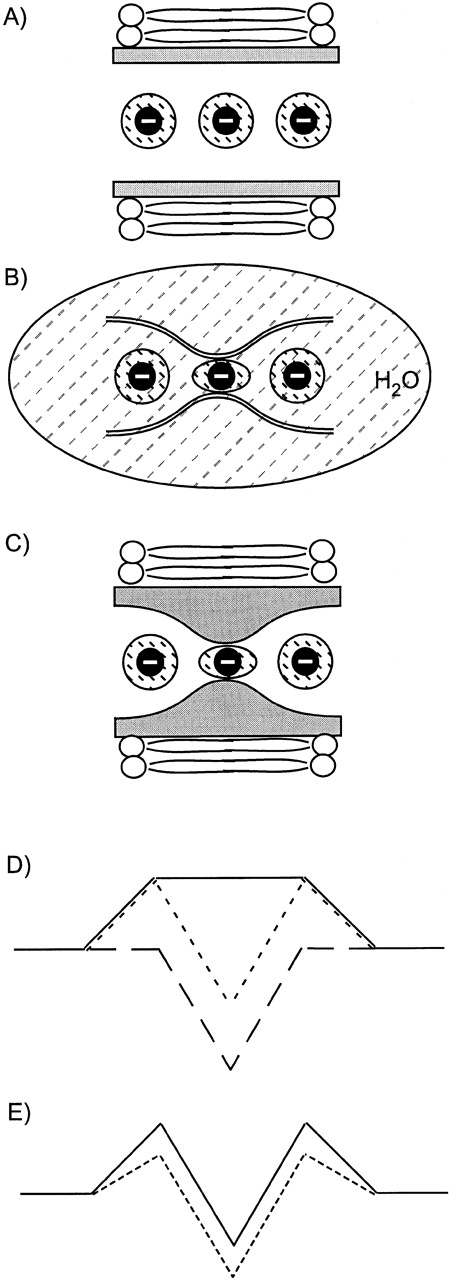 Figure 8. Model for permeation in Cl channels that exhibit lyotropic selectivity. (A) A channel that does not bind ions. An anion is indicated in three locations along with its inner sphere water molecules. (B) The inner âliningâ of the wtCFTR pore, with its anion binding site, suspended in water, with an anion in the proposed narrow region in which elements of the pore wall make inner sphere contact with the anion. (C) The wtCFTR channel with its anion binding site in a lipid bilayer. (D) The energetics of transfer. The solid trapezoidal line represents the energetic expense associated with partitioning into a âpolarizableâ tunnel embedded in a bilayer, envisioned in A. The dashed line represents the energetic well seen by an anion in the narrow region of the pore wall in free solution, as envisioned in B. The dotted line represents the profile of the total free energy (A + B) associated with traversing the wtCFTR channel embedded in a bilayer. The well depth and peak height are predicted to change in a parallel fashion due to the anion size-dependent changes in the free energy, which is shown in E for Cl (solid line) and a larger anion (dashed line), such as SCN. Anions that enter the channel more readily also bind more tightly.