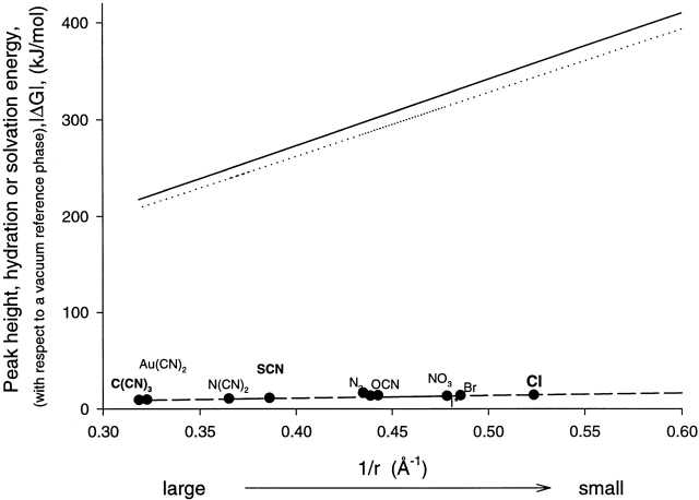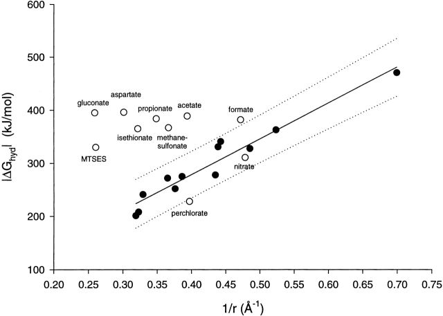 Figure 4. Energetics of CFTR permeability selectivity expressed with respect to a vacuum reference phase. The filled circles represent the relative peak heights (ΔGpeak, vacuum reference) calculated from the permeability ratios (Table ) and plotted as a function of reciprocal anion radius, 1/r (Table ). The solid line is the hydration energy, |ΔGhyd|, calculated using , and plotted versus 1/r. The dotted line is the solvation energy, |ΔGsolv|, calculated for a homogenous medium with a dielectric constant of 19 using vs. 1/r. The dashed line is the predicted peak barrier height, ΔGpeak, calculated from the difference between the hydration energy and the solvation energy (ΔGsolv − ΔGhyd).