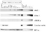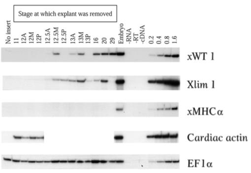 from 20 to 12.5. Expression of Xlim-1 is absent from stage 29. At this stage, it is possible to remove the developing pronephric tubules and duct before explanting the glomus. The absence of Xlim-1 transcripts therefore confirms that this dissection was performed accurately. Explants excised from stage 11 or 12 embryos did not express Xlim-1. This data concur with previous data that showed pronephric tubules are specified at stage 12. 5 (Brennan et al., 1998). Cardiac actin is expressed in explants removed at stages 11 and 12, thus proving that these ectodermal wraps did contain viable mesodermal tissue including somitetissue. The absence of xWT 1 expression in explants removed at these stages is not therefore due to the lack of viable explant within the ectodermal wraps, but to the absence of specified glomustissue. A no insert control was included consisting only of the ectodermal wrap. This sample was negative for all markers with the exception of EF-1α which is present within the animal caps that are used in the ectodermal wraps. Stage 33/34 embryos were used as a positive control. Other controls are as detailed for Fig. 2 above. For each sample, total RNA was extracted from 10 ectodermal wraps (or 2 control embryos) and subjected to RT-PCR analysis as detailed in the Materials and Methods above.