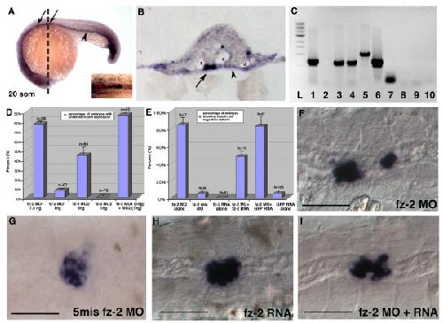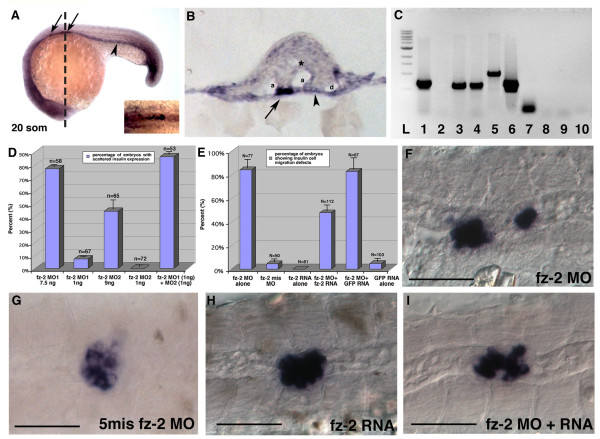 Figure 2. Migration defects in Fz-2 morphant embryos can be rescued by synthetic fz-2 mRNA. (A) Double in situ hybridization with fz-2 and insulin at 20 somite stage of development. Arrow, insulin; arrowhead, fz-2 expression in the endoderm; dotted line, approximate position of the section in (B). (B) A section of double in situ hybridization with fz-2 and insulin. Fz-2 is expressed more strongly on the surface of mesoderm and entire endoderm. Arrow, insulin; arrowhead, fz-2 expression in the endoderm; a, arteries; asterisk, neural tube; d, pronephric duct. (C) RT-PCR using cDNA made from sorted cells of transgenic insulin:GFP zebrafish embryos. L: ladder; lanes 1–5: GFP-negative cells; lanes 6–10: GFP-positive cells; lanes 1, 6: EF1α lanes2, 7: insulin; lanes 3, 8: fz-2 primer set #1; lanes 4, 9: fz-2 primer set #2; lanes 5, 10: wnt-5. (D) High-dose injection of either fz-2 MO1 or MO2 resulted in scattered insulin expression, whereas low dose injection of either MO caused such defects in less than 10% of embryos. Co-injection of low dose fz-2 MO1 and MO2 resulted in synergistic increase of percentage of embryos with scattered insulin expression. (E) 80% of fz-2 MO-injected embryos displayed scattered insulin expression. Co-injection of fz-2 MO and fz-2 RNA reduced the percentage of embryos with abnormal insulin expression down to 45%. (F-I) In situ hybridization with insulin at 24 hpf stage, anterior is to the left, (F) fz-2 MO1-injected embryo, (G) fz-2 mismatch MO-injected embryo, (H) fz-2 RNA-injected embryo, (I) fz-2 MO- and fz-2 RNA-co-injected embryo. Notice the compact islet in this embryo that displays an undulated notochord. |