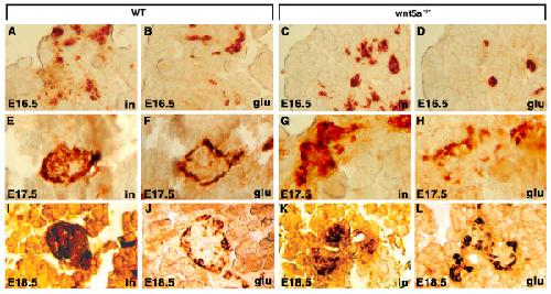 Figure 9. Pancreatic islet development in Wnt5a-/- mouse embryos is not delayed. (A-D) E16.5, (E-H) E17.5, (I-L) E18.5, (A, C, E, G, I, K) insulin antibody staining, (B, D, F, H, J, L) glucagon antibody staining, (A, B, E, F, I, J) pancreas tissue from wild-type siblings, (C, D, G, H, K, L) pancreas tissue from Wnt5a-/- mouse embryos. Notice that glucagon staining is round and spherical at E16.5, but positioned at the periphery of insulin cells at E17.5 and E8.5. |