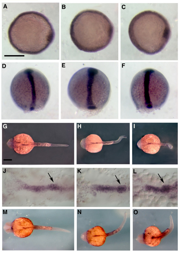 Figure 4. Early endoderm markers are not affected in Wnt-5 and Fz-2 morphant embryos. All pictures are dorsal views. (A, D, G, J, M) wild-type, (B, E, H, K, N) Fz-2 morphants, (C, F, I, L, O) Wnt-5 morphants. (A-C) mixer, 50% epiboly, (D-F) sox-17, 90% epiboly, (G-I) fox-A3, 24 hpf, (J-L) anterior endoderm expression of fox-A3, arrow, pancreatic endoderm, 24 hpf, (M-O) gata-6, 24 hpf. Scale bar = 300 μm. |