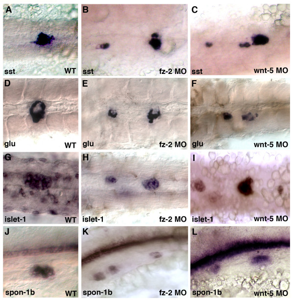 Figure 5. Wnt-5 and Fz-2 morphant embryos exhibit similar pancreatic islet defects at 24 hpf. In all panels, anterior is to the left and 24 hpf. .A-I, dorsal view; J-L, lateral view. (A, D, G, J) Wild-type embryos. (B, E, H, K) Fz-2 morphants. (C, F, I, L) Wnt-5 morphants. In situ hybridization analysis of (A, B, C) somatostatin, (D, E, F) glucagon, notice a hollow spot in the middle of each patch, (G, H, I) islet-1, (J, K, L) fspondin-2b. Note scattered pancreatic cells in Fz-2 and Wnt-5 morphants. |