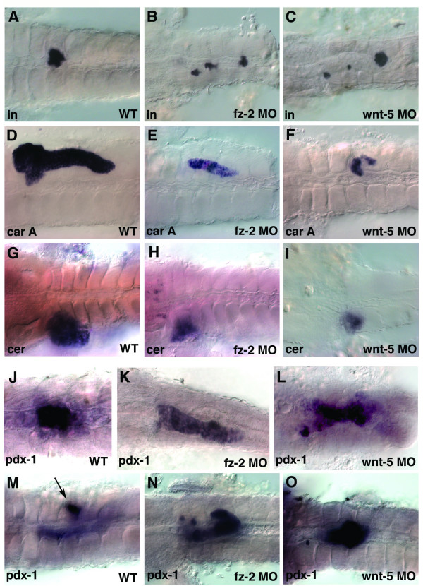 Figure 6. Wnt-5 and Fz-2 morphant embryos have other similar defects. In all panels, view is dorsal, anterior is to the left. (A-I, M-O) 3dpf, (J-L) 24 hpf stage. (A, D, G, J, M) Wild-type embryos. (B, E, H, K, N) Fz-2 morphants. (C, F, I, L, O) Wnt-5 morphants. In situ hybridization analysis of (A-C) insulin, (D-F) carboxypeptidase A, notice the hollow spot indicating the position of the islet, (G-I) ceruloplasmin, (J-O) pdx-1, (M) arrow, pdx-1-staining in islet. |
