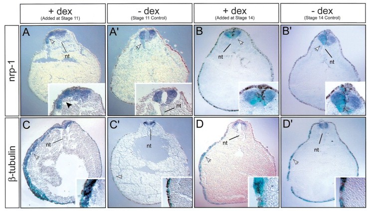 (A-D') Coronal sections of embryos depicting the expression of nrp-1, and b-tubulin. VP16-POUGR mRNA was injected at the 8-16 cell stage into a dorsal animal blastomere (20-100 pg) (head lineage, including the nervous system, A, A', B, and B') or ventral animal blastomere (200 pg) (belly epidermis, C, C', D, and D'), and embryos were subsequently treated with dex at stage 11 or 14 and collected at stage 20-22. The embryos treated with dex at stage 11 show increased nrp-1 expression (A; black arrowhead in the inset shows the expanded region) and ectopic expression of b-tubulin (C) only in the injected sides (turquoise). However, embryos that were treated with dex at stage14 display a normal pattern of expression for both nrp-1 and b-tubulin (B and D, respectively). The non-dex-treated embryos also show a normal pattern of expression for both genes (A', B', C', and D'). White arrows depict the enlarged region shown in the insets. Abbreviations: nt, notochord.