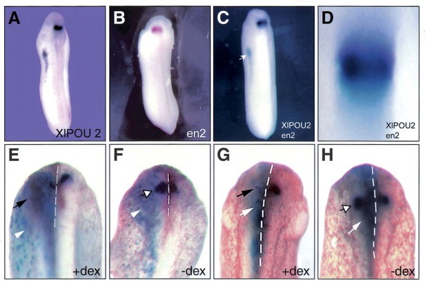 Fig. 5. Potential regulation of en-2 by XlPOU 2 in the MHB. (A) Expression pattern of XlPOU 2 by whole-mount in situ hybridization of a stage 24 embryo (dorsal view). XlPOU 2 is expressed predominantly in the MHB (black arrow) and in the pronephros (white arrow). (B) Expression pattern of en-2 by wholemount in situ hybridization of a stage 24 embryo (dorsal view). En-2 is expressed in the MHB. (C) Expression pattern of XlPOU 2 and en-2 by double wholemount in situ hybridization of a stage 24 embryo (dorsal view). XlPOU 2 expression (white arrows), is visualized as the turquoise reaction product of alkaline phosphatase (BCIP). (D) A high magnification view of XlPOU 2 and en-2 co-localized at the MHB (dark purple; magenta-phosphate 1 BCIP). (E,F) VP16-POU-GR injected and dex-treated embryo shows an expansion of the MHB (E; black arrows), while non-dex treated embryo shows normal expression pattern for en-2 (F; white arrows show b-gal staining and an arrow outlined in black indicates the normal boundary of en-2 expression). (G,H) ENG-POU-GR dramatically reduces en-2 expression in the injected and dex-treated embryo (compare G and H; white arrows indicate the b-gal staining and a black arrow show repression; H, an arrow outlined in black indicates the normal boundary of en-2 expression).