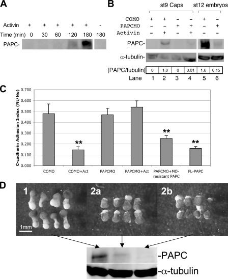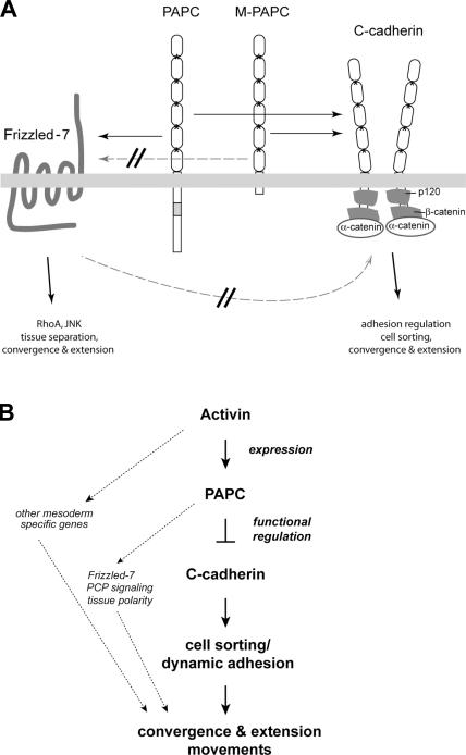 Little is known about how protocadherins function in cell adhesion and tissue development. Paraxial protocadherin (PAPC) controls cell sorting and morphogenetic movements in the Xenopus laevis embryo. We find that PAPC mediates these functions by down-regulating the adhesion activity of C-cadherin. Expression of exogenous C-cadherin reverses PAPC-induced cell sorting and gastrulation defects. Moreover, loss of endogenous PAPC results in elevated C-cadherin adhesion activity in the dorsal mesoderm and interferes with the normal blastopore closure, a defect that can be rescued by a dominant-negative C-cadherin mutant. Importantly, activin induces PAPC expression, and PAPC is required for activin-induced regulation of C-cadherin adhesion activity and explant morphogenesis. Signaling through Frizzled-7 is not required for PAPC regulation of C-cadherin, suggesting that C-cadherin regulation and Frizzled-7 signaling are two distinct branches of the PAPC pathway that induce morphogenetic movements. Thus, spatial regulation of classical cadherin adhesive function by local expression of a protocadherin is a novel mechanism for controlling cell sorting and tissue morphogenesis.