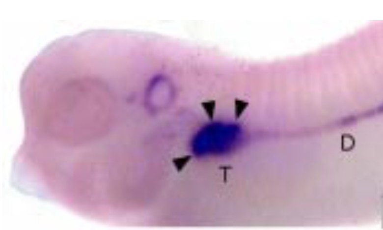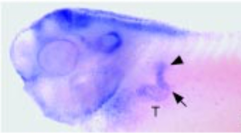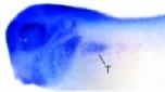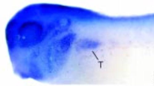 gene expression in seen in the pronephric mesenchyme, which will develop into the pronephric tubules (T), as well as CNS and head tissues. |
