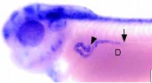 pax8 (paired box 8) gene expression in Xenopus laevis embryo, assayed via in situ hybridization, NF stage 32, lateral view, anterior left, dorsal up.