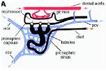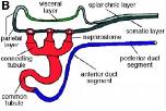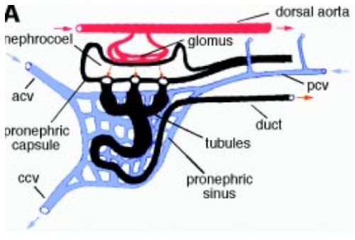 Fig. 1. Basic organization of the Xenopus pronephric kidney. (B) Segmental organization of pronephric nephrons. The pronephric capsule is comprised of visceral and parietal epithelia. The visceral (or podocyte) layer (green) is a specialized segment of the splanchnic mesoderm. It contacts the vasculature of the glomus and is continuous with the epithelium of the parietal layer. Pronephric tubules (red) are subdivided into nephrostomes, connecting tubules, and the common tubule. Finally, the pronephric duct (blue) is comprised of at least two parts, the anterior and posterior duct segments. Abbreviations: acv, anterior cardinal vein; ccv, common cardinal vein; pcv, posterior cardinal vein. |