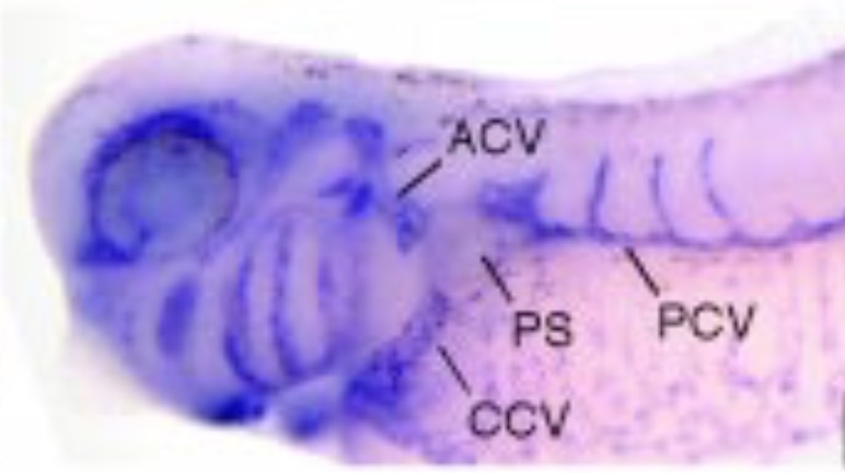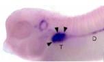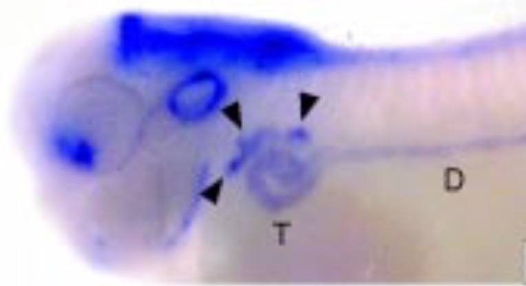 In the developing pronephric kidney, expression is largely restricted to the nephrostomes (arrow heads), as well as the brain, trigeminal nerve and pharyngeal region. |