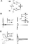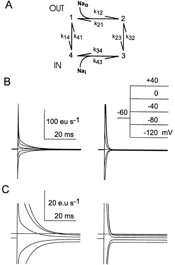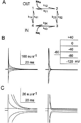 Figure A1. Simulations of slippage mode behavior. (A) Four state kinetic scheme used to simulate the slippage mode. (B) Simulated currents in response to voltage steps indicated in the inset. The parameters for the simulations on the left were: k012 = 8, 000 M−1 s−1, k021 = 2,000 s−1, k023 = 5 s−1, k014 = 120 s−1, k041 = 60 s−1, k034 = 100 s−1, k043 = 1,000 M−1 s−1, α′ = 0.3, α″ = 0.3, δ = 0.4, Nao = 0.1 M, Nai = 0.01 M, T = 20°C. The effect of alkylation (right) was simulated by a 10-fold increase in k014 and k041. (C) Expanded view of the traces in A, which also shows the steady state current levels under the two conditions. The broken line indicates zero baseline current. Note that the current scale (eu, electronic units) gives the apparent charge movement per cotransporter. |