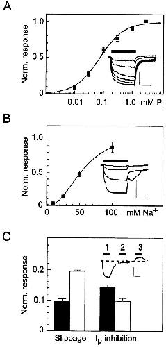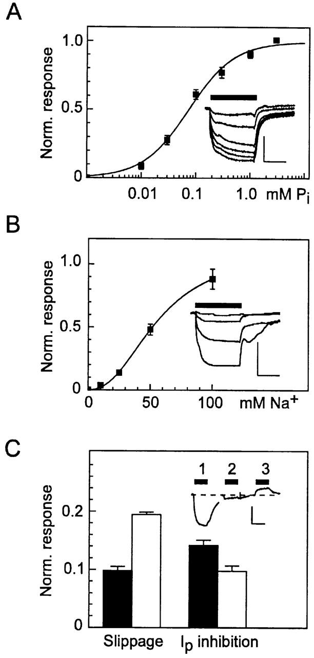 Figure 4. Steady state kinetics of oocytes expressing S460C. (A) Pi dose response determined from original records such as shown in the inset (scale: vertical, 50 nA; horizontal, 10 s) at 100 mM Na+. Data points are pooled from four oocytes from the same batch. was fit to the dose–response data for each cell and the data points were normalized to the predicted maximum current. Continuous line is refit of to the pooled data, giving a Hill coefficient, nPi = 1.04 ± 0.07 and apparent Pi affinity, KmPi = 0.081 ± 0.01 mM. (B) Na+ dose response determined from original records such as shown in the inset (scale: vertical, 50 nA; horizontal, 10 s), at 1 mM Pi. Data points are pooled from three oocytes from the same batch. Data were treated as in A. Fit of (continuous line) gave a Hill coefficient nNa = 2.35 ± 0.21 and apparent Na+ affinity KmNa = 56.3 ± 4.0 mM. (C) Effect of PFA on the slippage mode (left) and cotransport mode (right) for WT (filled bars) (n = 9) and S460C (open bars) (n = 5). Inset shows an original recording from a cell expressing S460C: (1) response to 0.3 mM Pi, (2) response to 0.3 mM Pi and 3 mM PFA, (3) response to 3 mM PFA. Traces have been aligned to the baseline current in the absence of substrate (dashed line). For the slippage mode assay, bars represent the ratio of trace 3 response to trace 1 response. For cotransport mode assay, bars represent the ratio of trace 2 response to trace 1 response, both relative to the level in the presence of PFA alone (trace 3). |