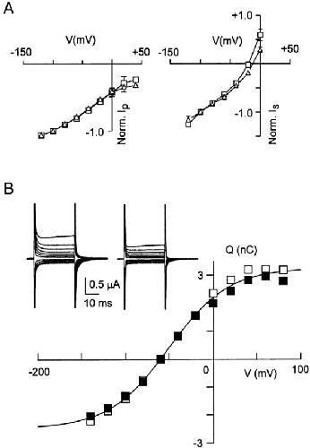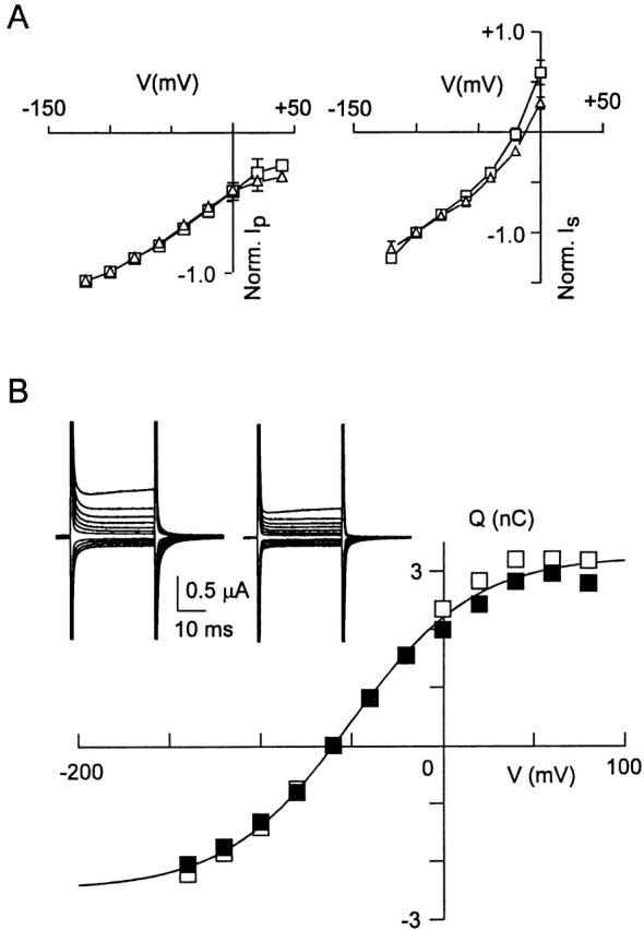 Figure 5. Mutant S460C and wild type show comparable voltage dependence. (A) Steady state current–voltage curves for representative cells expressing wild type (□) and S460C (▵) for the cotransport (left) and slippage (right) modes. For cotransport mode, the current (Ip) represents difference between current induced by 1 mM Pi and current in absence of Pi normalized to the value at −100 mV (n = 4). For slippage mode, the current (Is) represents difference between the holding current and current induced by 3 mM PFA, normalized to the value at −100 mV (n = 4). SEMs smaller than symbol size are not shown. (B) Pre–steady state relaxations induced by voltage steps from −60 mV holding potential to voltages in the range −140 to +80 mV in ND100 solution. Inset shows original records before (left) and after (right) application of 3 mM PFA. Q–V curve found by integrating the transient current after subtraction of the PFA response. (▪) ON charge movement, (□) OFF charge movement. Continuous line is fit of to mean of ON and OFF charges, which gave fit parameters: Qmax = 5.7 nC, z = 0.7; V0.5 = −51 mV. |