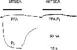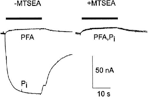 Figure 6. Effect of alkylation by MTSEA on Pi and PFA response for cells expressing S460C. Substrate was applied during the period indicated by the bar. Cell was voltage clamped to −50 mV. Note that after alkylation, the 3 mM Pi and 3 mM PFA responses superimpose and are identical to the PFA response before alkylation. Vh = −50 mV. |