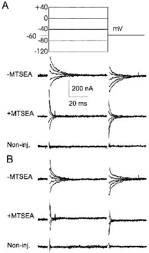 Figure 7. Pre–steady state charge kinetics are faster after MTSEA incubation. Recordings of pre–steady state relaxations from a representative oocyte expressing S460C, superfused in ND100 solution (A) and ND0 solution (B) before MTSEA application (100 μM, 2 min, top) and after MTSEA application (middle). Bottom traces were recorded from a noninjected oocyte from the same batch under the same superfusion conditions (without MTSEA). In each case, oocytes were voltage clamped at −60 mV holding potential and records are shown for voltage steps according to the protocol in A. Each record is the average of eight sweeps with records obtained in 3 mM PFA, 100 mM Na+ was subtracted to eliminate capacitive charging transient. Records were low-pass filtered at 2 kHz and sampled at 50 μs/point. All records were blanked for the first 1.5 ms during the charging period of the oocyte. For this cell, the response to 3 mM Pi before MTSEA was −100 nA, and after MTSEA it was +15 nA relative to the holding current at −50 mV. |