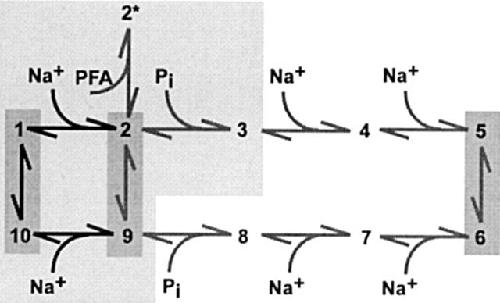 Figure 9. Kinetic Scheme for Type II Na+/Pi Cotransport. States occupied in the cis (outward facing) orientation are 1–5. States occupied in the trans (inward facing) orientation are 6–10. The three modes of operation that involve transmembrane reorientation, as revealed by steady state and pre–steady state studies of WT, are indicated by dark shading: empty carrier (10 ⇔ 1), slippage (2 ⇔ 9), and cotransport (5 ⇔ 6). At least two voltage-dependent transitions have been identified: empty carrier (10 ⇔ 1) and first external Na+ binding/release step (1 ⇔ 2). The voltage dependence of the last Na+ binding/release step on the trans side (9 ⇔ 10) has not been characterized. PFA binding places the system in state 2*, which when occupied prevents the slippage and cotransport modes. The lightly shaded region indicates those transitions and associated states that have been shown to remain intact after alkylation. In addition, the zero voltage rate constants for the empty carrier mode increase after alkylation (see text). |