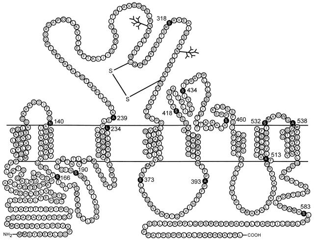 Figure 1. Topological representation of the rat type IIa sodium phosphate cotransporter (rat NaPi-IIa). Scheme is based on current hydropathy data and a recent topology study (Lambert et al. 1999) in which eight membrane spanning regions (TM1–TM8) are predicted with extracellular loops between TM1–TM2, TM3–TM4, TM5–TM6, and TM7–TM8, and both the carboxy and amino termini are intracellular. (•) Positions of 15 residues that were individually mutated to cysteines (see methods and materials). |