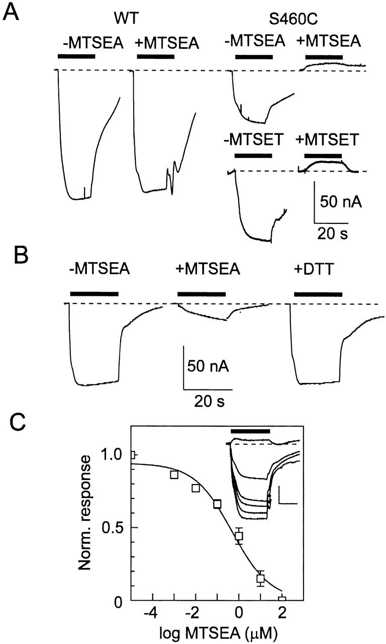 Figure 2. Alkylation using MTSEA leads to a suppression of the electrogenic response in oocytes expressing mutant S460C. (A) Comparison of the Pi-induced current for an oocyte expressing the WT NaPi-IIa before and after exposure to 100 μM MTSEA (left) and two oocytes expressing S460C before and after exposure to 100 μM MTSEA or MTSET for 2 min (right). Bars represent time of application of 1 mM Pi. Dashed line indicates baseline holding current level. Note that Pi induces an upward deflection in the holding current after alkylation. (B) Restoration of Pi response by 15-min incubation in 10 mM DTT (right) for a cell expressing S460C. Incubation in 1.5 μM MTSEA exposure (middle) inhibited the initial Pi response (left) by 80%. (C) Dependency of the Pi response on MTSEA concentration. Inset gives a set of original records showing Pi response (applied during bar) for an oocyte expressing S460C after exposure to successive 10-fold increasing doses of MTSEA from 0.001 to 10 μM. Scale: vertical 50 nA, horizontal 20 s. For this cell, after exposure at 10 μM MTSEA, Pi induced an upward deflection of the baseline current. There was no change in the response after exposure to 100 μM MTSEA. Dose response is pooled from five oocytes. The Pi-induced response was calculated relative to the Pi-induced current after alkylation in 100 μM MTSEA, and was then normalized to the initial response for each cell. Curve is a fit of to the data, which gave an apparent half-maximal concentration = 0.5 μM. |