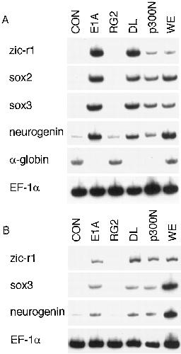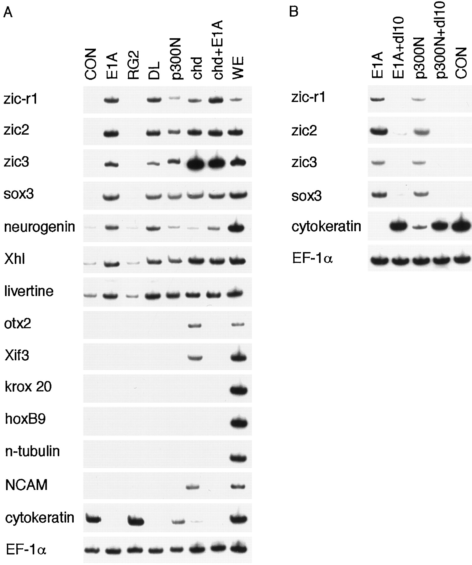 Figure 3. Neuralization without anteroposterior patterning in animal pole explants. A, Induction of neural markers was examined at stage 20 by RT-PCR. Note the concomitant suppression of cytokeratin, an epidermal marker. RNA injected per embryo: 5 pg for E1A, RG, and DL; 3 ng for p300N; 1 ng for chordin (chd). Note that neurogenin was not induced by chordin at this stage, as expected from published results (see Discussion; Lamb et al., 1993; Papalopulu and Kintner, 1996). Similar results were obtained when noggin was used in place of chordin (data not shown). B, E1A or p300N induction of neural markers and suppression of cytokeratin could be rescued by p300(dl10), coinjected at 1 ng of RNA per embryo. |
