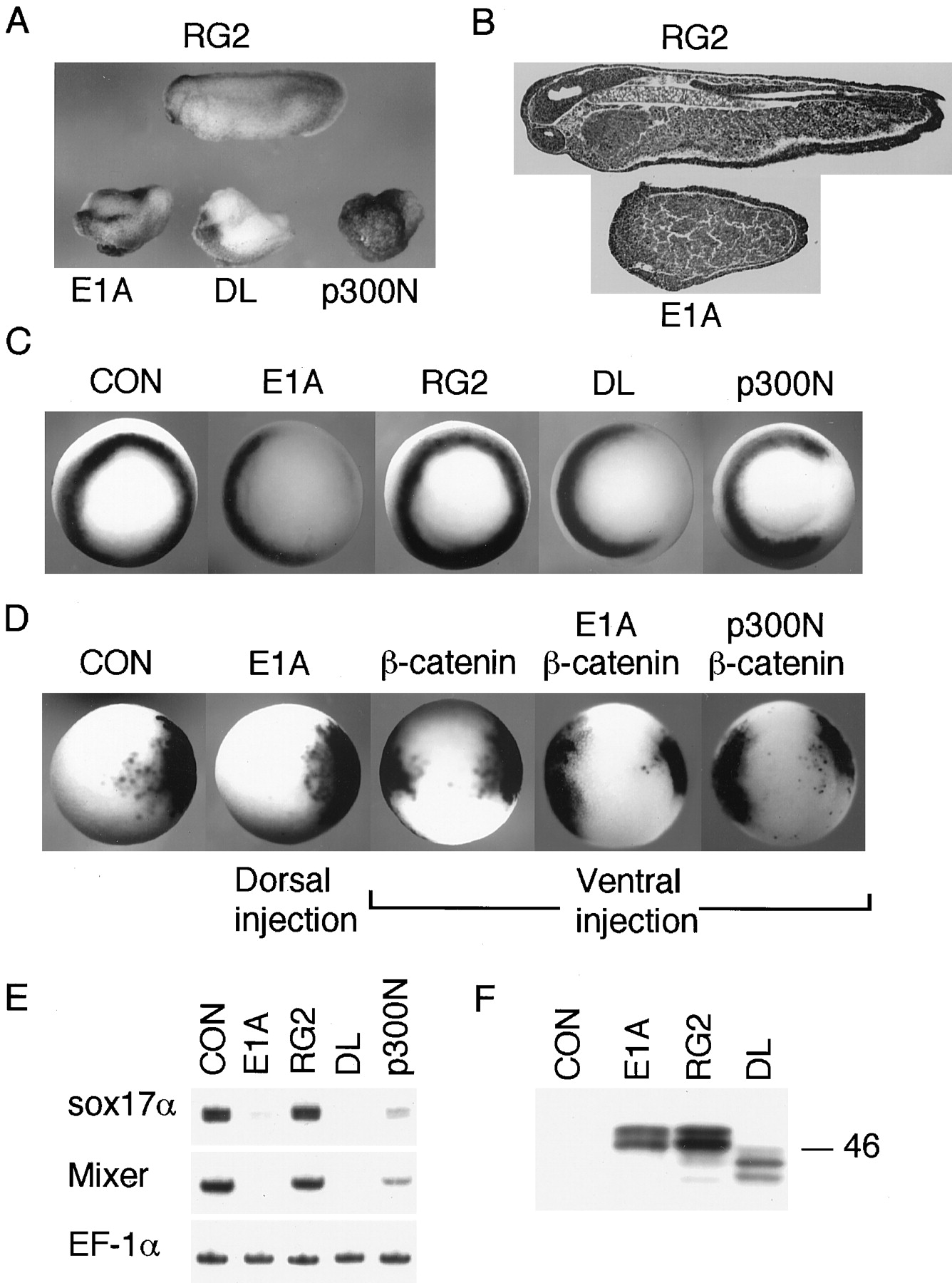 Figure 1. Inhibition of p300/CBP by E1A, E1AâRG2, and p300N interferes with mesoderm and endoderm development. A, Phenotypes of embryos injected dorsally at four-cell stage with E1A, RG2, DL120â 140 (DL), and p300N RNAs, shown at stage 25. E1A, DL120â140, and p300N-injected embryos cleaved and developed normally up through the late blastula stage (stage 9) but began to exhibit severe gastrulation abnormality from the early gastrula stage (stage 10.5). A failure of blastopore closure was observed in many of the injected embryos (stage 13). Most of injected embryos displayed a lack of any axial development at stage 25. The RG2-injected embryo is phenotypically identical to normal controls. RNA injected per embryo: 0.1 ng for E1A, RG2, and DL120â140; 2 ng for p300N. Note that because p300N mRNA and protein sizes are each approximately seven times of those for E1A, the efficiency of synthesis and the local concentration of p300N protein are likely to be much smaller than those of E1A in the embryo if the same amount of RNA were to be injected. B, Sagittal sections of a RG2 (top) and an E1A-injected embryo (bottom) at stage 25. Note that the RG2-injected embryo exhibits normal development, whereas the E1A-injected one lacks any axial tissues, such as the notochord and muscles. Axial tissues are absent in all sections (data not shown). C, Inhibition of Xbra expression examined at stage 10.5 by in situ hybridization. Note that the control (CON) and RG2-injected embryo exhibit a uniform circumferential expression pattern, whereas expression is abolished on the injected side (either dorsal or ventral) in E1A, DL120â140, or p300N-injected embryos. Dorsal is to the right. RNA injected per embryo: 20 pg for E1A, RG2, and DL120â140; 500 pg for p300N. D, Lack of inhibition of Xnr3 expression by in situ hybridization analysis, examined at stage 10.5. Note that the endogenous Xnr3 expression is not blocked by dorsally injected E1A, and an ectopic induction of Xnr3 by ventrally injected b-catenin (0.5 ng RNA per embryo) is not inhibited by coinjected E1A or p300N. Ectopic activation of goosecoid expression by b-catenin was inhibited significantly by E1A, as expected (data not shown), because goosecoid expression depends on mesoderm-inducing signals (Watabe et al., 1995). Dorsal is to the right. RNA amount injected is the same as in C. E, Inhibition of Xsox-17a and Mixer expression assayed by quantitative RT-PCR. In this and all of the following RT-PCR results, EF-1a is used as a control for the template amount. The RNA amount injected is the same as in A. F, Immunoblot of stage 9 embryo extracts to examine protein levels of E1A, E1AâRG2 (RG2), and E1AâDL120â140 (DL) from injected synthetic RNAs. CON, Uninjected control extract. |