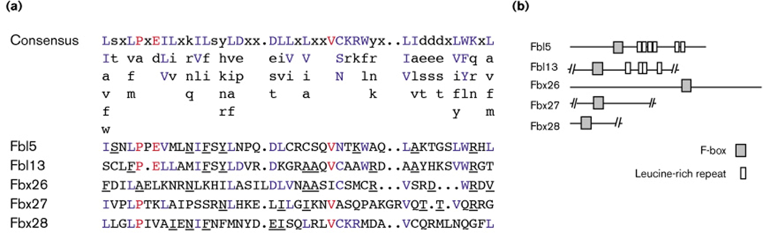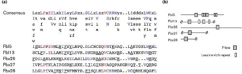 A family of F-box proteins in Xenopus laevis, isolated through their ability to bind Skp1. (a) Alignment of F-box domain sequences. The F-box domains from Fbl5, Fbl13, Fbx26, Fbx27 and Fbx28 were aligned using CLUSTAL V. The consensus sequence is shown above. Red, most highly conserved; blue, highly conserved; underline, similar. Dots indicate gaps. The clones were isolated the following number of times: Fbl5 (3), Fbl13 (1), Fbx26 (395), Fbx27 (5), Fbx28 (1). (b) Schematic representation of the domain structures of X. laevis F-box proteins.