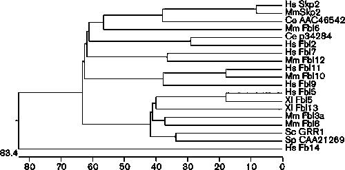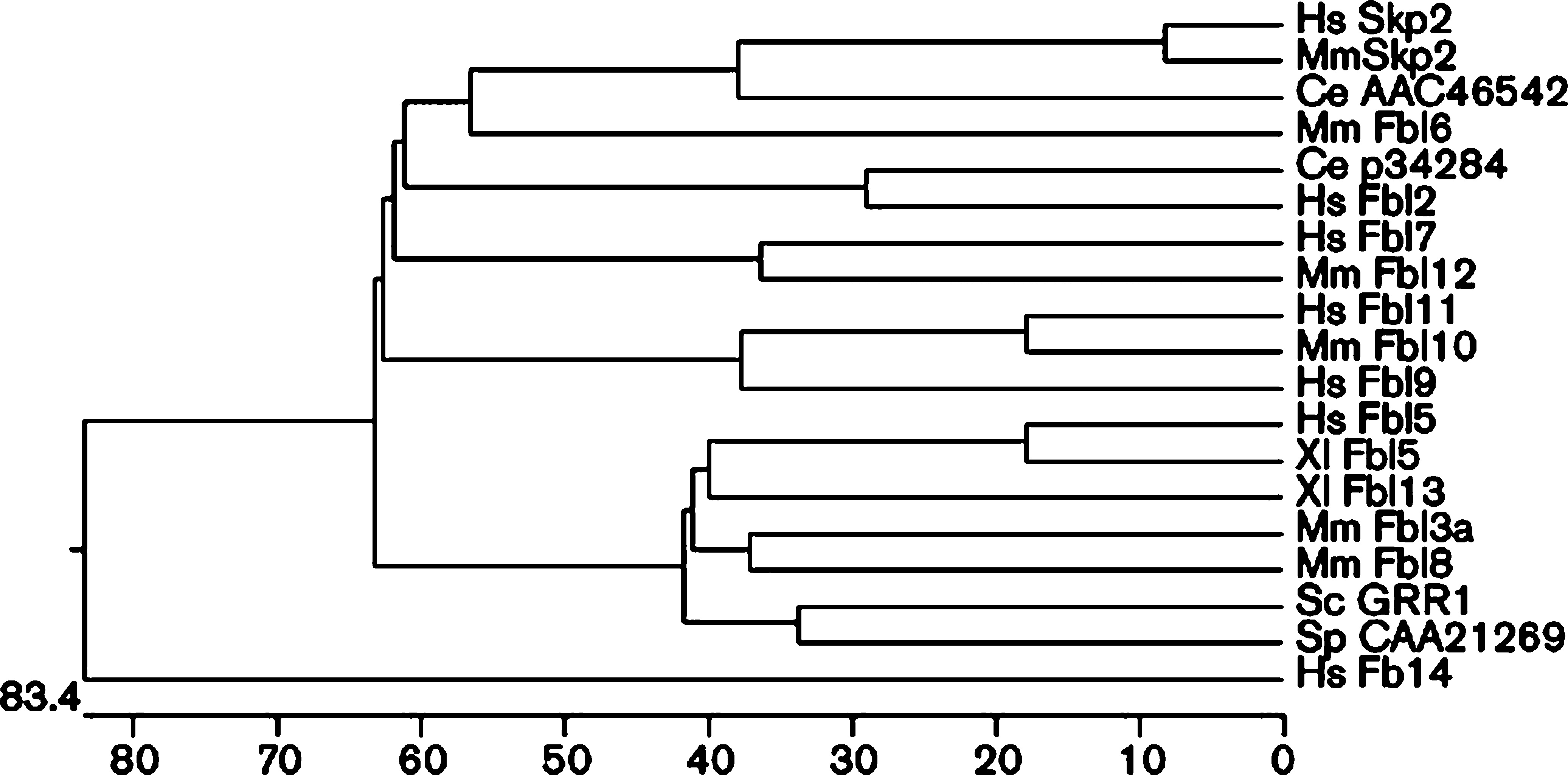 Phylogenetic tree showing evolutionary relationships within the subfamily of F-box proteins characterized by leucine-rich repeats. Ce, Caenorhabditis elegans; Hs, Homo sapiens; Mm, Mus musculus; Sc, Saccharomyces cerevisiae; Sp, Schizosaccharomyces pombe; Xl, X. laevis.