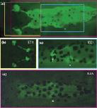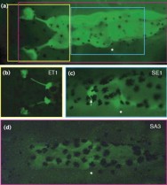 Figure 3. Gene trap embryos expressing the GFP within the brain. (a) Dorsal view of the head of a transgenic embryo containing a GFP fusion under the control of the neural β-tubulin promoter (NBT-GFP). GFP expression is observed throughout the brain, including the cranial nerves. This embryo serves as a reference for positioning the expression of the different gene trap embryos along the anterior-posterior axis. The colored boxes outline the regions of the head photographed in (b, yellow), (c, blue) and (d, red). (b) ET1 was generated using the exon trap vector ET. GFP fluorescence was restricted to the olfactory placodes, nerves and bulbs. (c) SE1 was generated using the SEGT gene trap vector and expressed GFP in the pineal gland (arrow) and the midbrain-hindbrain junction (asterisk in panels (a), (c) and (d)). (d) SA2 was generated using the SAGT gene trap vector. Expression was observed weakly throughout the brain.