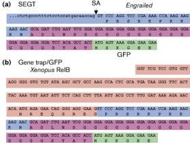 Figure 4. Cloned gene trap sequences. (a) Nucleotide and predicted amino acid sequences of the Engrailed 2/gly-GFP junction in the SEGT gene trap vector. A vertical arrow indicates the splice site. The Engrailed 2 SA sequence is shown in blue with the intron in lowercase letters and the exon in uppercase letters. The glycine bridge is shown in purple and GFP in green. (b) Sequence obtained from a trapped gene obtained using a 5â² RACE PCR approach (shown in pink). The predicted amino acid sequence is indicated underneath the nucleotide sequence.