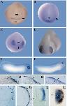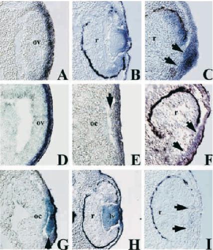 (I) When Xlens1 is overexpressed, γ-crystallin expression is absent from the thickened lensectoderm (arrows), a pattern identical to control PLE (not shown). Magnification, 150(A,C,D,G), 165(H), 175(B), 190(E).