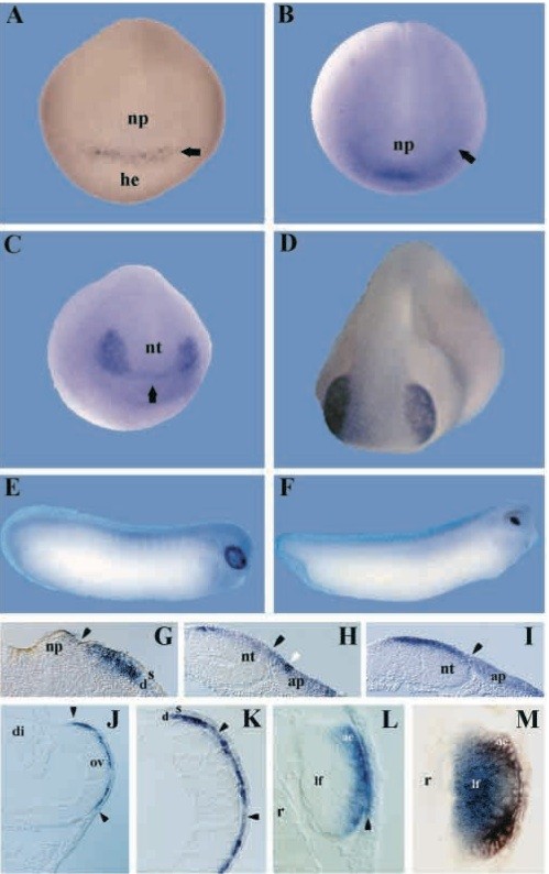 Fig. 2. Expression of Xlens1 mRNA during development. (A-D) are anterior views of the head and (E-F) are lateral views. (A) Xlens1 is first detected at stage 13 in a narrow field across the anterior midline (arrow), separating the anterior neural plate (np) from ventralheadepidermis (he). (B) At stage 15 Xlens1 expression has spread laterally to the anterior- lateral margins of the neural plate (np), reaching the limits of the trigeminal placode anlagen (arrow). (C) At stage 18 the midline expression of Xlens1 is depleted (arrow), and the lateral patches adjacent to the anterior neural tube (nt) are prominent. (D) At stage 22 Xlens1 expression is confined to the ectoderm overlying the optic vesicle. (E) At stage 28, Xlens1 expression is confined to the ectoderm overlying the optic cup. (F) At stage 34, only the lens vesicle expresses Xlens1. (G) Sagittal section through the midline band at stage 15. Xlens1- expressing cells are in the superficial (s) and deep (d) layers of the ectoderm, just anterior to the anterior rim (arrowhead) of the neural plate (np). Anterior, right; dorsal top. (H) Sagittal section through the midline at stage 18. Xlens1 expression is mostly depleted from the midline cells of the anterior ectodermal placode (ap), which will become the adenohypophyseal and olfactory placodes. A few Xlens1-expressing cells are still detected (white arrowhead) just anterior to the most rostral edge (black arrowhead) of the neural tube (nt). (I) Sagittal section through the lateral patch of Xlens1 expression in the same stage 18 embryo as in H. Xlens1 expression is mostly depleted from the placode (ap) anterior to the neural tube (nt), but is at high levels in both the superficial and deep (sensorial) layers of the ectoderm overlying the lateral aspects of the neural tube. Arrowhead delineates between the neural tube and the placode. (J) Transverse section through the optic vesicle (ov) at stage 22 embryo. Xlens1 expression is confined to the ectoderm overlying the vesicle. There is a sharp depletion of Xlens1 expression at dorsal and ventral points (arrowheads) where mesoderm intervenes between the optic vesicle and surface ectoderm. di, diencephalon. Dorsal, up; lateral, right. (K) Higher magnification of J, demonstrating that only the deep (d, sensorial) layer of cells in the PLE express Xlens1. Some cells (arrowheads) appear to have downregulated Xlens1 expression. s, superficial layer. (L) Transverse section of a stage 31/32 lens vesicle. Xlens1 is expressed only in the anterior epithelial cells of the lens (ae), adjacent to the surface ectoderm. The inner layer of the surface ectoderm (cornea) covering the lens vesicle also appears to express this gene (arrowhead). r, retina. (M) Transverse section of a stage 34 lens vesicle depicting both β-crystallin (blue) and Xlens1 (brown) expression. The lens fiber cells (lf) express β-crystallin, but do not express Xlens1. Magnification, 70(G-I), 75(J), 170(K), 250(L,μ).