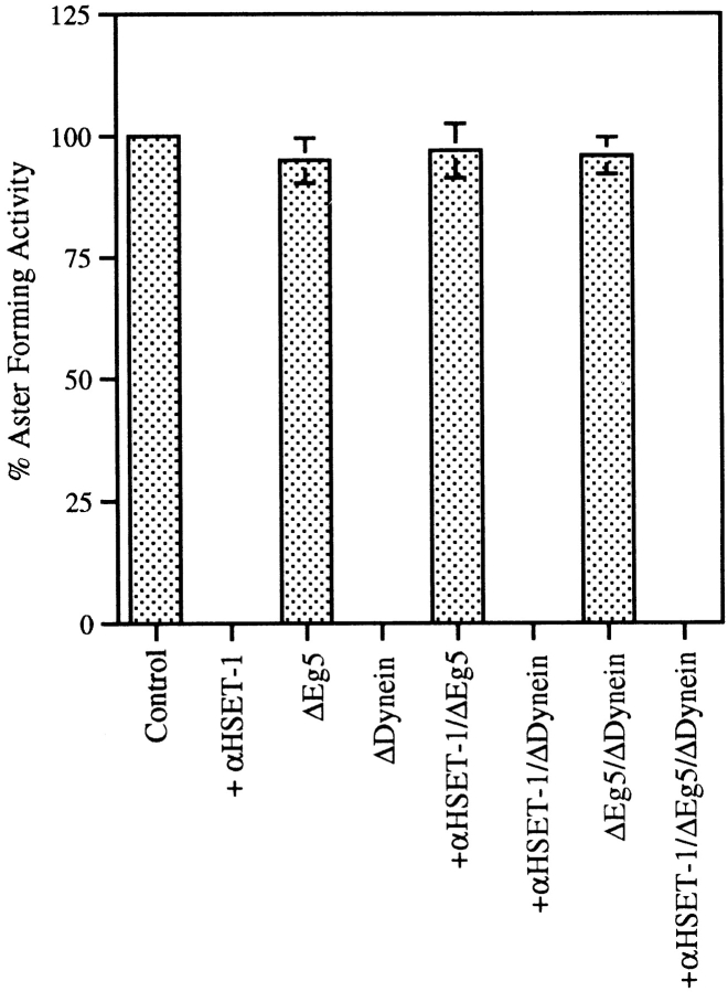 We have prepared antibodies specific for HSET, the human homologue of the KAR3 family of minus end-directed motors. Immuno-EM with these antibodies indicates that HSET frequently localizes between microtubules within the mammalian metaphase spindle consistent with a microtubule cross-linking function. Microinjection experiments show that HSET activity is essential for meiotic spindle organization in murine oocytes and taxol-induced aster assembly in cultured cells. However, inhibition of HSET did not affect mitotic spindle architecture or function in cultured cells, indicating that centrosomes mask the role of HSET during mitosis. We also show that (acentrosomal) microtubule asters fail to assemble in vitro without HSET activity, but simultaneous inhibition of HSET and Eg5, a plus end-directed motor, redresses the balance of forces acting on microtubules and restores aster organization. In vivo, centrosomes fail to separate and monopolar spindles assemble without Eg5 activity. Simultaneous inhibition of HSET and Eg5 restores centrosome separation and, in some cases, bipolar spindle formation. Thus, through microtubule cross-linking and oppositely oriented motor activity, HSET and Eg5 participate in spindle assembly and promote spindle bipolarity, although the activity of HSET is not essential for spindle assembly and function in cultured cells because of centrosomes.