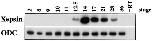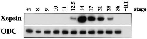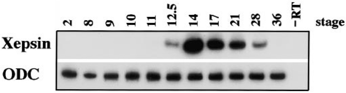 FIG. 2. Temporal expression of Xepsin gene during early Xenopus development analyzed using reverse transcriptase-PCR (RT-PCR). Total RNAs (0.4 mg) were used as templates to generate first-strand cDNA. Radiolabeled Xepsin and ODC sequences were amplified from first-strand cDNA and separated on polyacrylamide gels. The numbers refer to embryonic stages. [Stage 2, two-cell; stage 8, morula; stage 9, late blastula; stage 10, early gastrula; stage 11, midgastrula; stage 12.5, late gastrula; stage 14, early neurula; stage 17, midneurula; stage 21, late neurula; stage 28, late tailbud; stage 36, swimming tadpole.] ODC was used as an internal standard control.