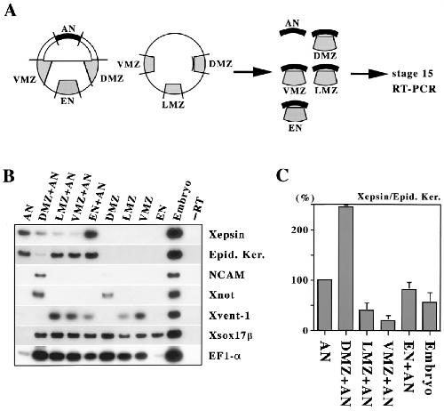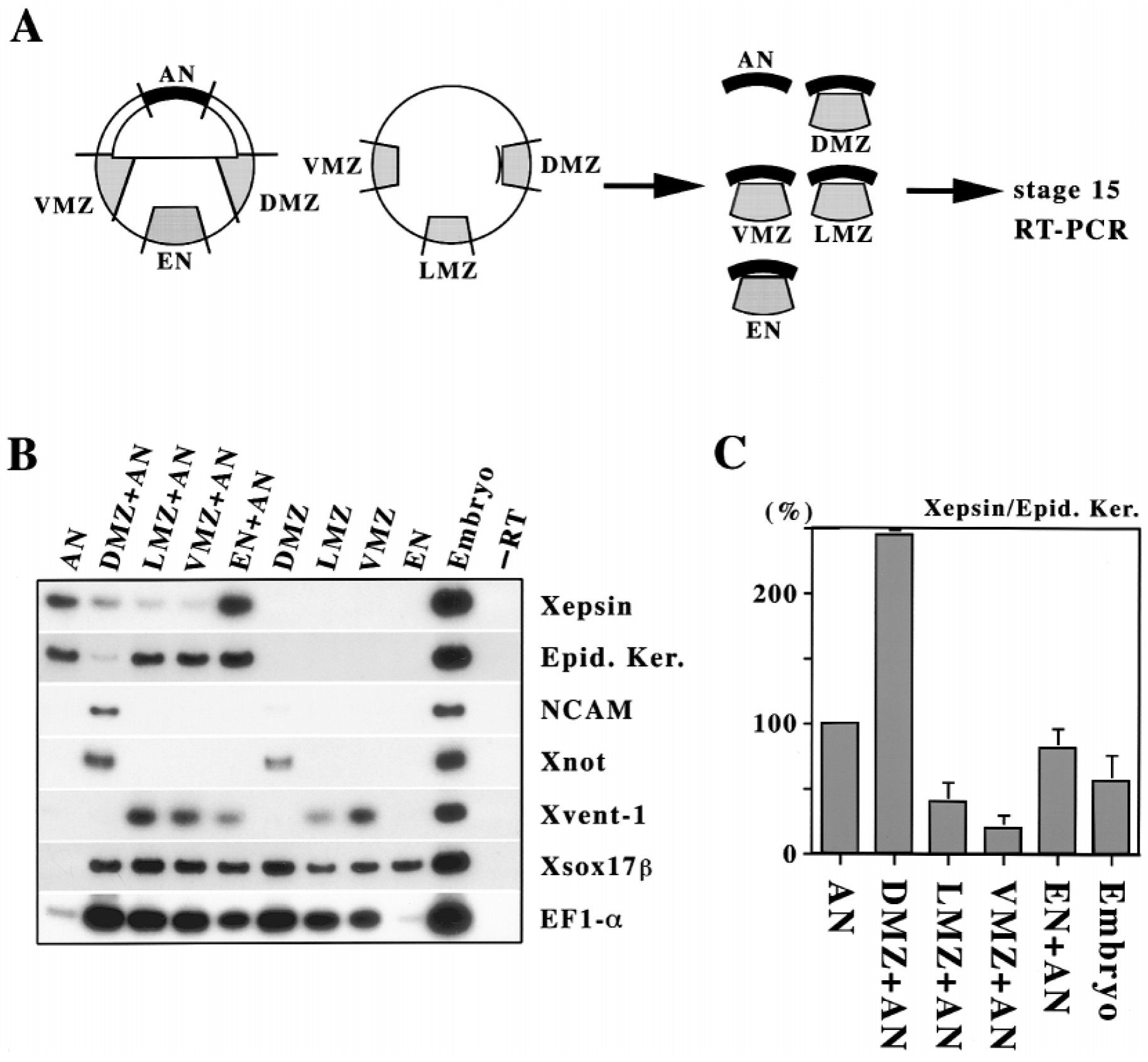 FIG. 5. Analysis of the Xepsin expression in conjugates. (A) Experimental scheme. Animal caps (AN) and other explants (DMZ, dorsal marginal zone; LMZ, lateral marginal zone; VMZ, ventral marginal zone; and EN, endoderm) were isolated from stage 10.25 embryos (lateral view, left; vegetal view, right). Each explants was incubated either alone or as conjugates with animal cap and harvested at stage 15 for RT-PCR. (B) The expression of Xepsin and other marker genes in conjugates were analyzed by RT-PCR. Total RNAs from one explant equivalent, one conjugate equivalent, or one embryo equivalent were used as templates to generate first-strand cDNA. Epidermal keratin (Epid. Ker.) is specific for epidermis. NCAM is a neural-specific marker. Xnot is a dorsal mesoderm markers. Xvent-1 is expressed in the ventrolateral mesoderm. Xsox17b is a endodermal marker. EF1-a was used as RT-PCR control for RNA recovery. 2RT, sibling control embryo without reverse transcriptase. (C) Radioactivity level of each Xepsin band in B was measured with a laser image analyzer. The Xepsin expression, normalized by the epidermal keratin, is presented as a histogram. One-hundred percent expression of Xepsin was defined as the level seen in animal cap alone.